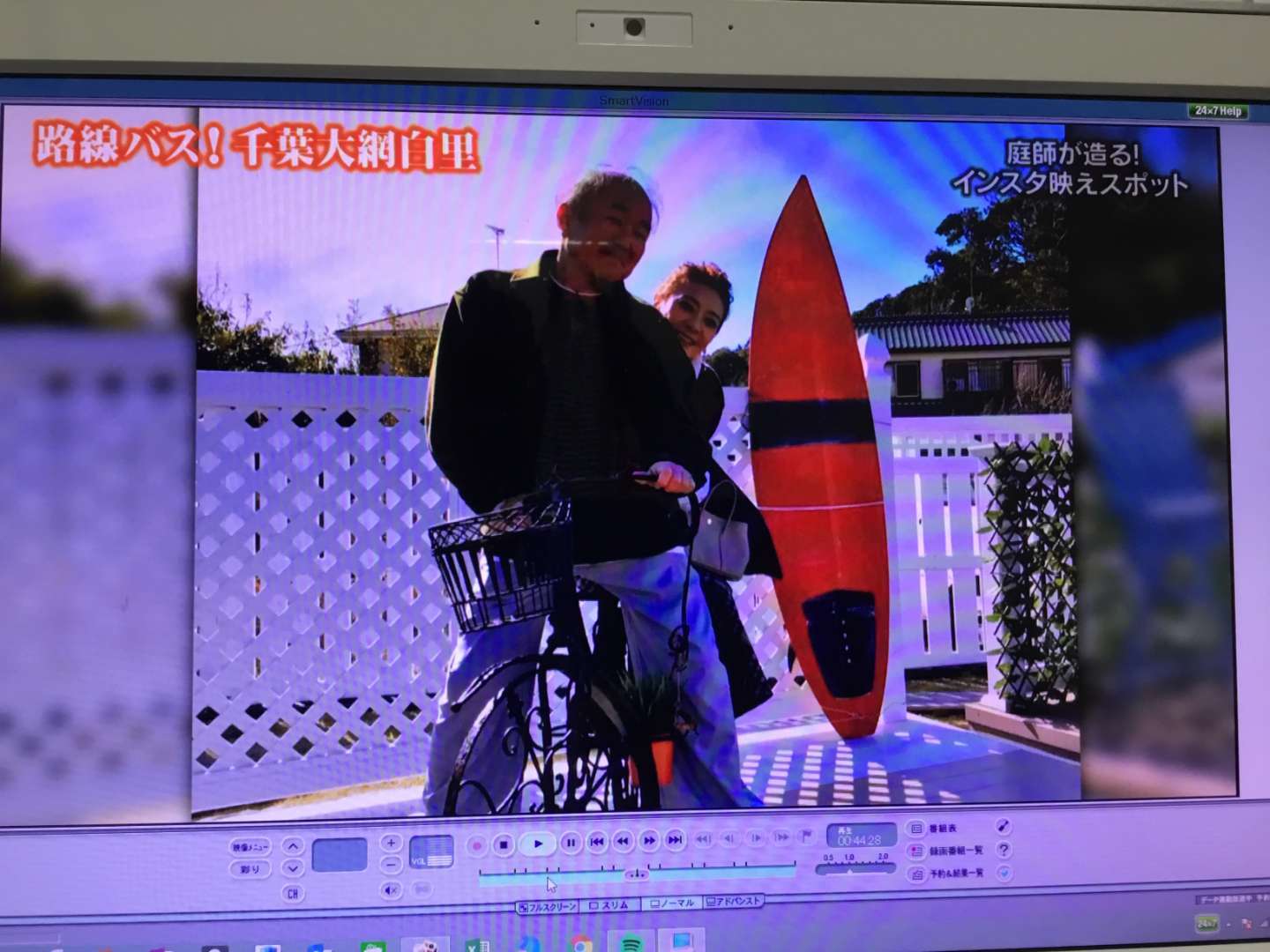 サーフボードをバックに自転車にまたがった熟年夫婦よろしく・・