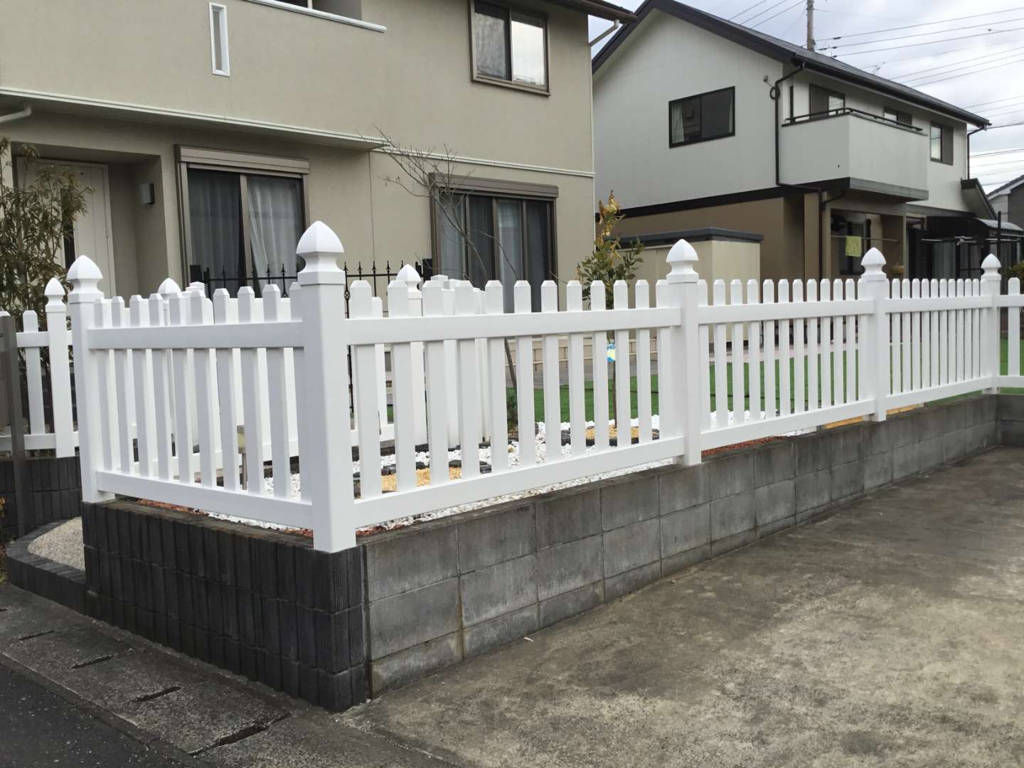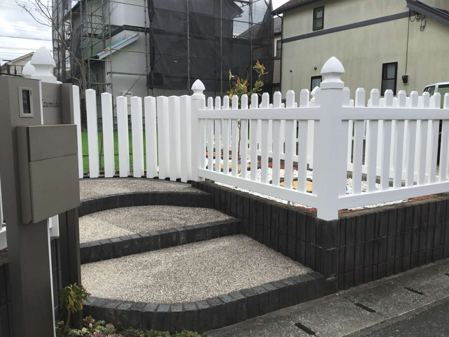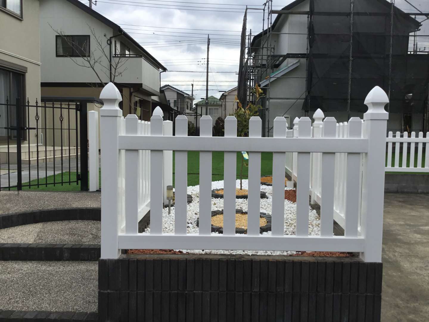 バイナルフェンスは当然、直線部分に設置しますが、 このように曲線をつくる場合、バイナル柱を立てて表現します。 高さも自由になりますから、段々にしたり思い思いに設置できます。